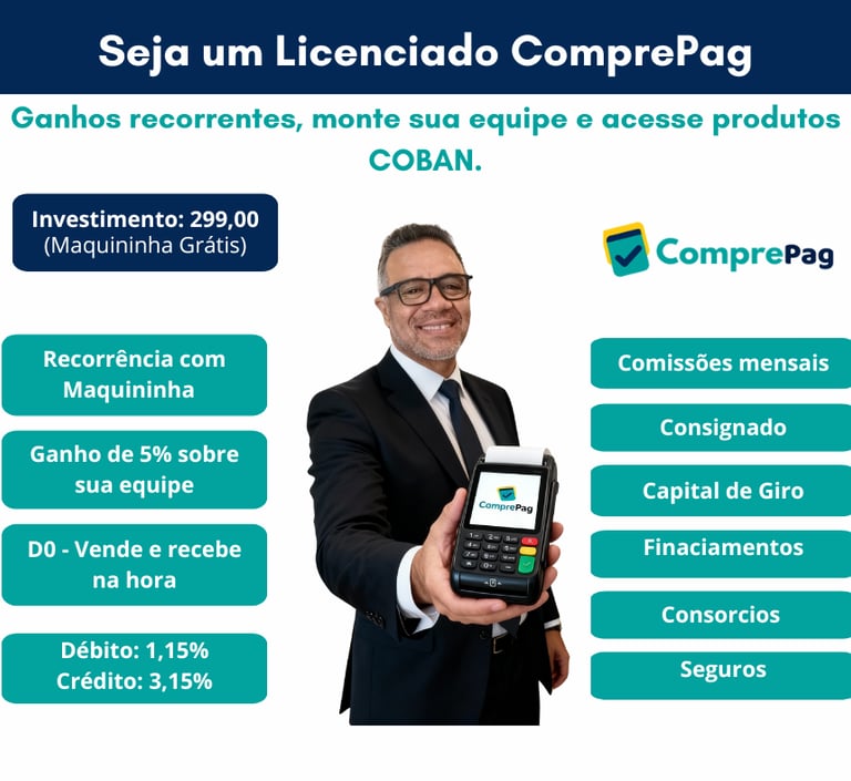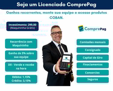 “A ComprePag é hoje uma das soluções mais completas para MEIs e pequenos negócios. Trabalhamos com as menores taxas do mercado — 1,15% no débito e 3,5% no crédito — com recebimento D0 e máquina grátis sem meta de faturamento. Além disso, oferecemos um portfólio financeiro completo com empréstimos, capital de giro, seguros, consórcios e muito mais. É uma solução que reduz custos, melhora o fluxo de caixa e ainda dá acesso a crédito de forma simples e rápida.”